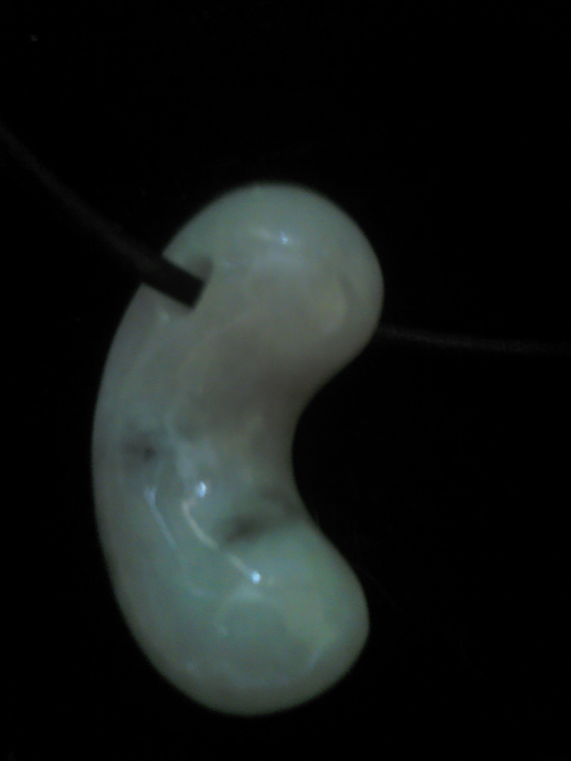 でも、レムリアンシードの勾玉が3cmだったので、一緒に革紐に付ければいいかな?と思っていたら、これが結構大きい!しかも、厚さも2cmあるので、翡翠を見分ける「光に透かす」という方法では見分けられませんでした。なんでも、厚さのある翡翠は、懐中電灯を直接当てないと透けないものもあるとか。でも、表面の和紙模様ははっきり見えるので、染めにしろ何にしろ翡翠であることは間違いなさそうです。